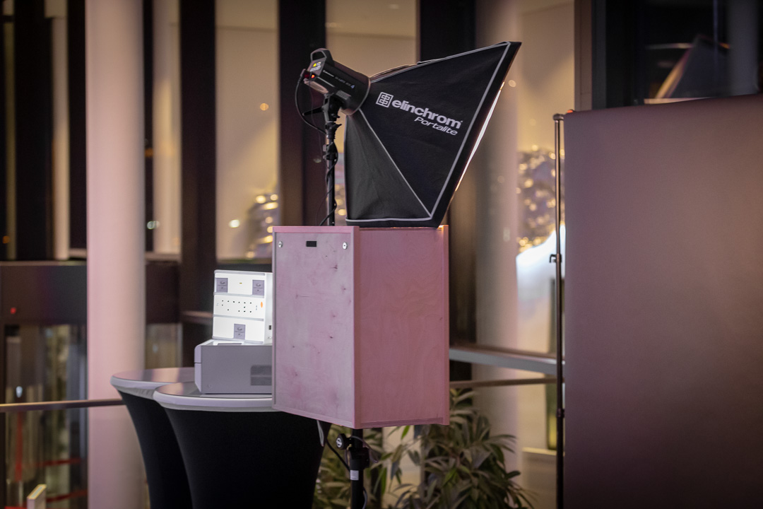 Wir übernehmen die Einrichtung der Fotobox mit Hintergrundsystem und Drucker.